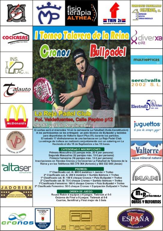 Del 16 al 18 de Septiembre se celebrará, en las recientemente estrenadas instalaciones de La Reja Padel en el polígono de Valdefuentes (Pepino), el I Torneo Cronos-Bullpadel de Talavera de la Reina.