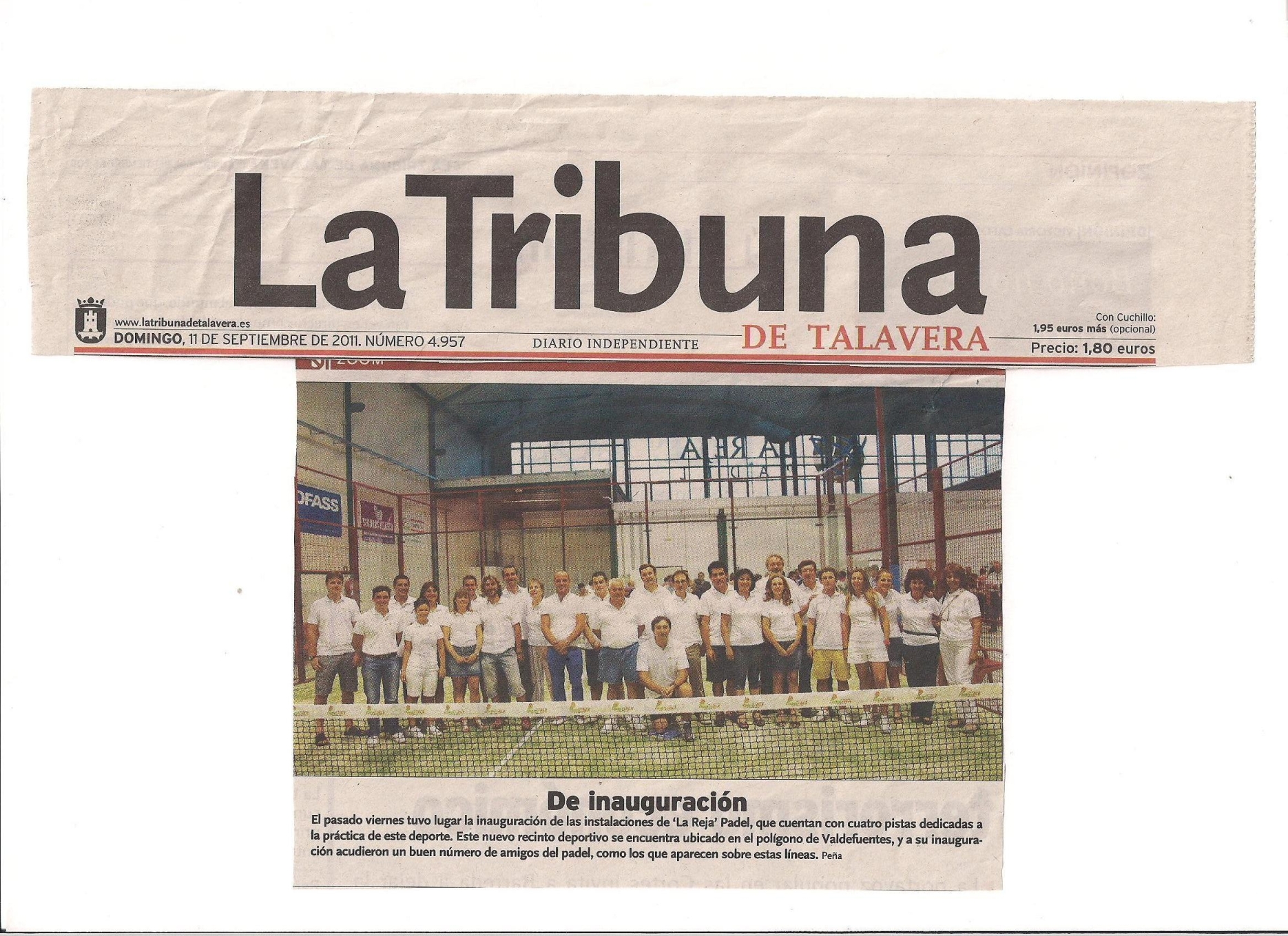 GeneralTalavera de la Reina Inauguración de La Reja Padel en la prensa escrita 12 septiembre 2011 LE Así apareció la inauguración de la Reja Padel en la prensa escrita: Compartir en redes: