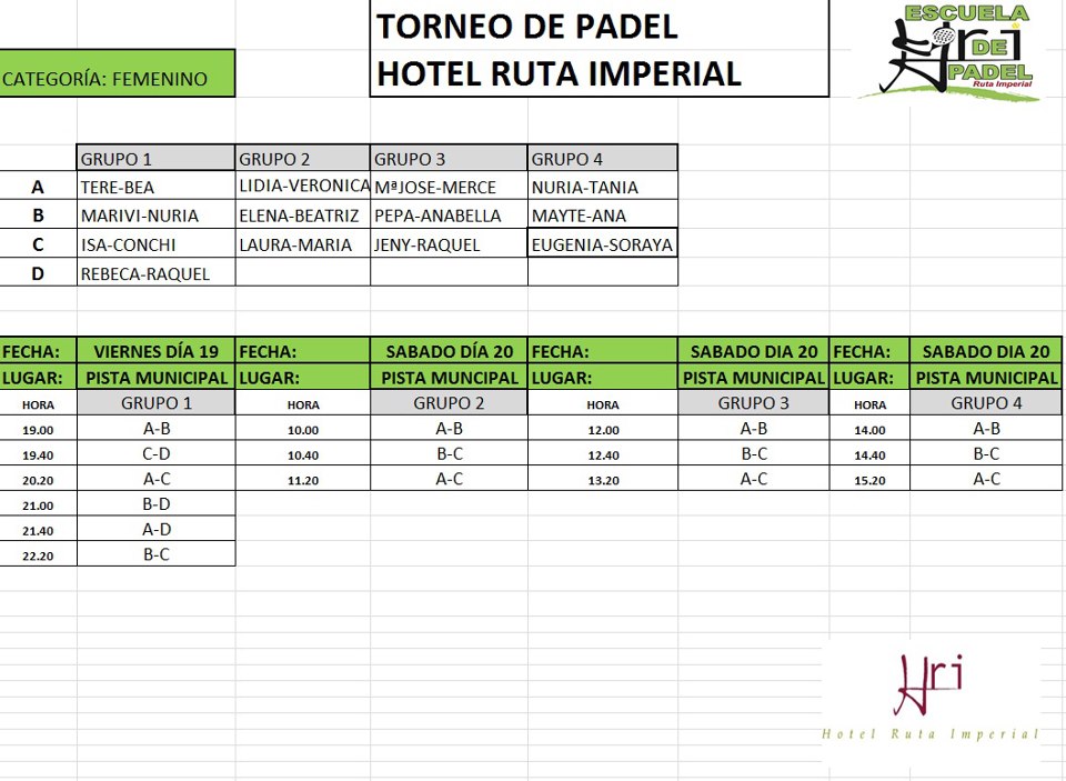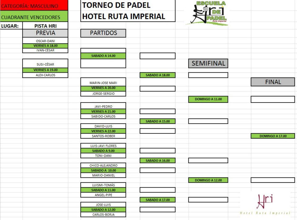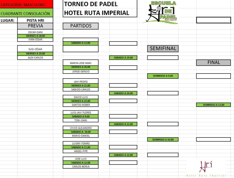 GeneralLa VeraTorneos Cuadrantes del Torneo de Pádel Imperial 18 octubre 2012 LE Aquí dejamos los cuadrantes de juego del Torneo de Pádel Imperial que se celebrará este fin de semana en Jarandilla de La Vera. ¡ Mucha suerte a todos ! CUADRANTE FEMENINO: CUADRANTE MASCULINO: CUADRANTE CONSOLACION MASCULINA: Compartir en redes: