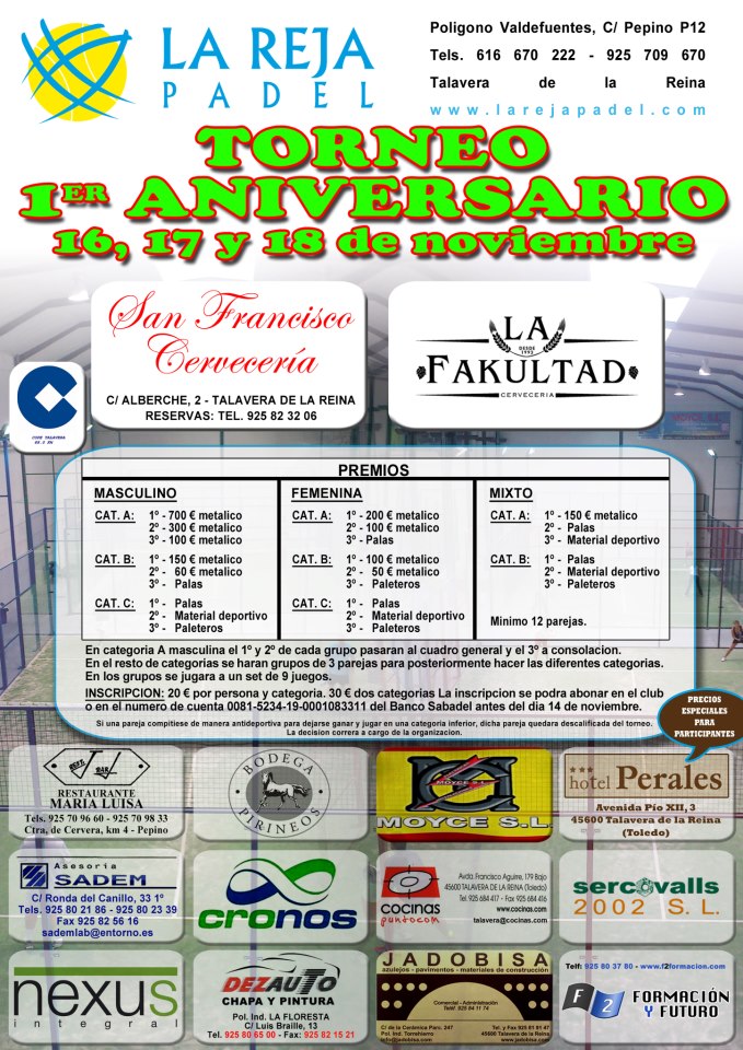 Desde aquí os recordamos que está a punto de finalizar el plazo para la inscripción en el Torneo Primer Aniversario La Reja Pádel. Si quieres disfrutar de un magnífico ambiente de pádel que irá aderezado con alguna sorpresa no dejes de participar.