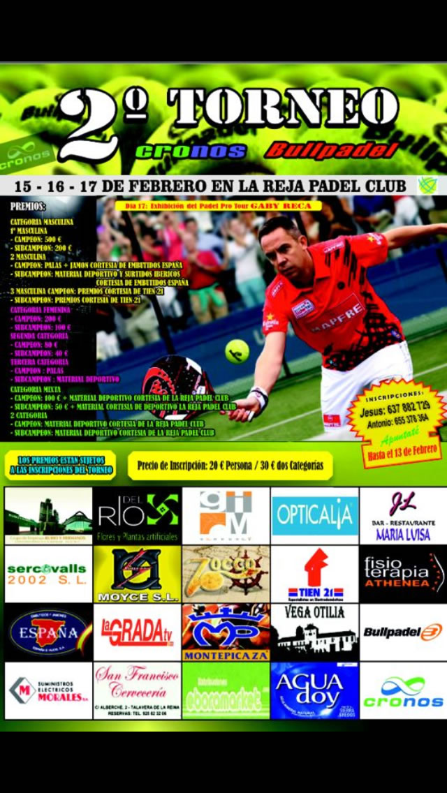 Por si esto no fuera poco el último día del torneo se cerrará con una exhibición del jugador profesional Gaby Reca (semifinalista del Master Estrella Damm del Pádel Pro Tour de 2012, junto a su compañero Agustín Gómez Silingo, el cuál, hace muy poco tiempo, ya había visitado y jugado en las intalaciones de La Reja Pádel con unos amigos)
