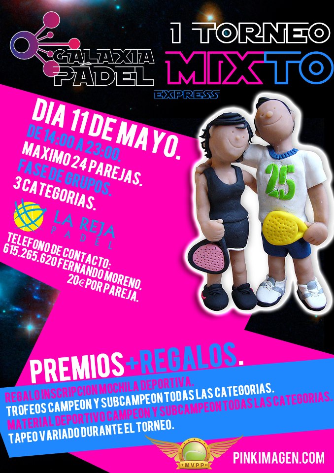 Durante la tarde del día 11 de mayo se celebrará el I Torneo Mixto Galaxia Pádel en las instalaciones de La Reja Pádel. El cupo de parejas está restringido a 24, y, según nos informan los organizadores, ya está cubierto. No obstante se ha abierto la posibilidad de apuntarse a la reserva por si alguna de las parejas fallara por cualquier motivo.