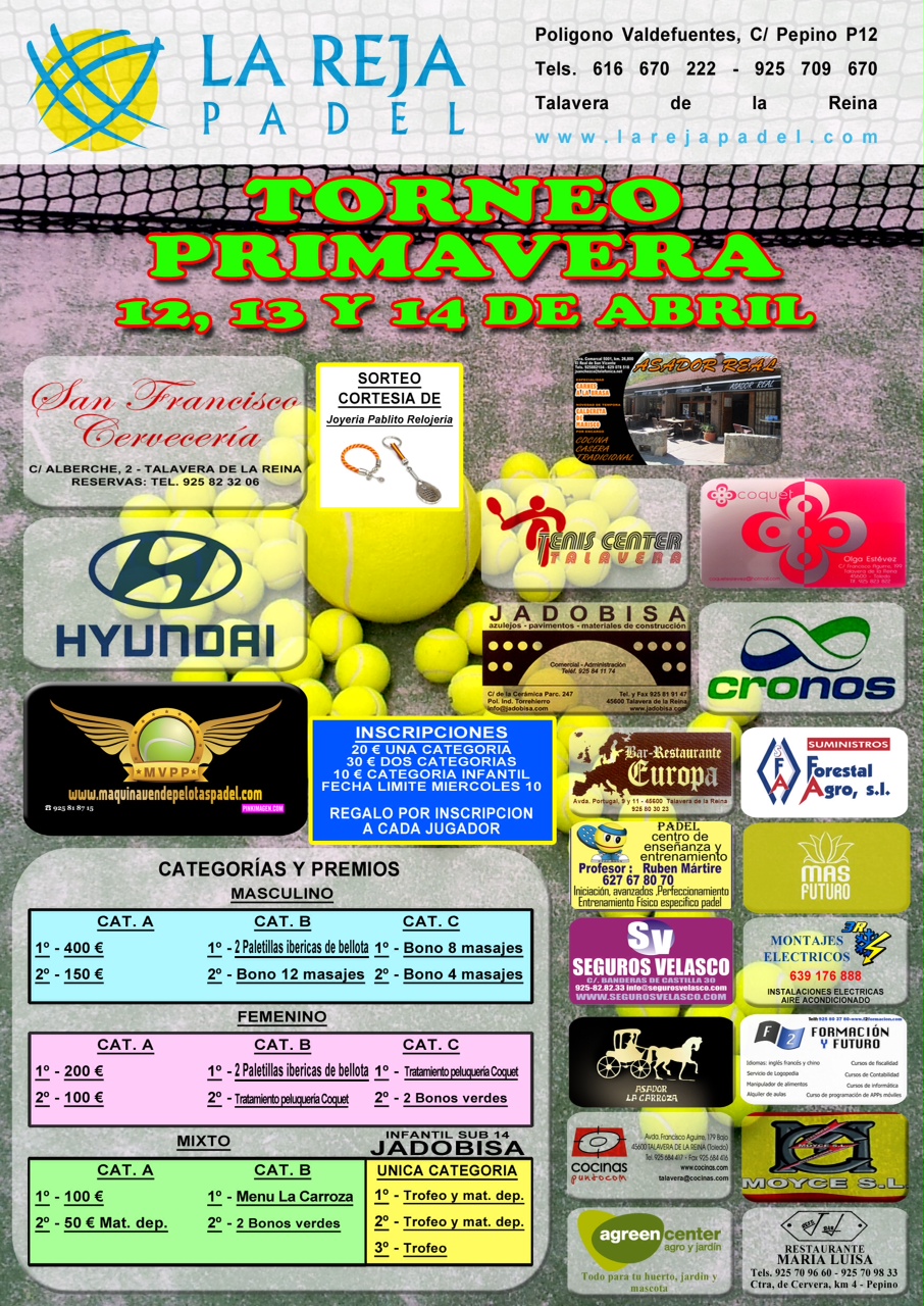 Durante los días 12, 13 y 14 de abril se va a celebrar, en las instalaciones de La Reja Pádel, uno de esos torneos que nadie se quiere perder. Tiene todos los ingredientes. Muchas categorías: Masculina(A,B,C), Femenina(A,B,C), Mixta(A,B) e Infantil (Sub-14). Como siempre, se producirán enfrentamientos dentro de los grupos para determinar las categorías a las que se optará.
