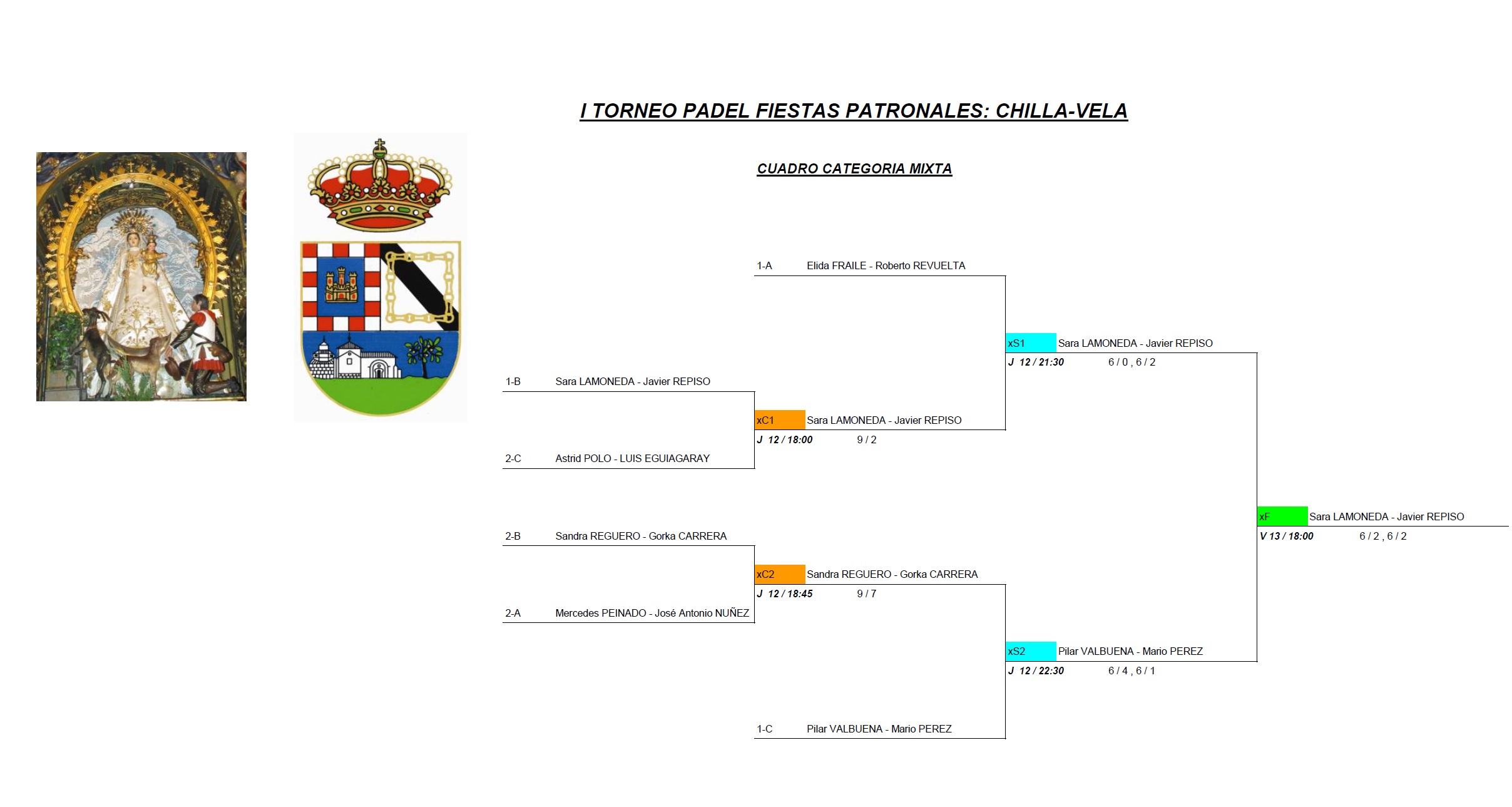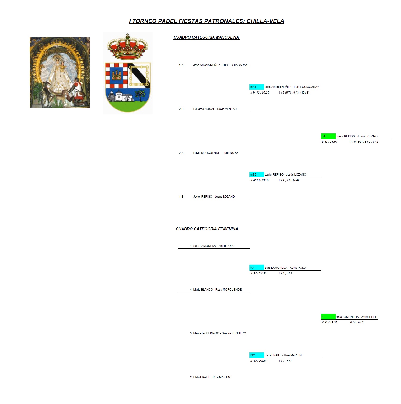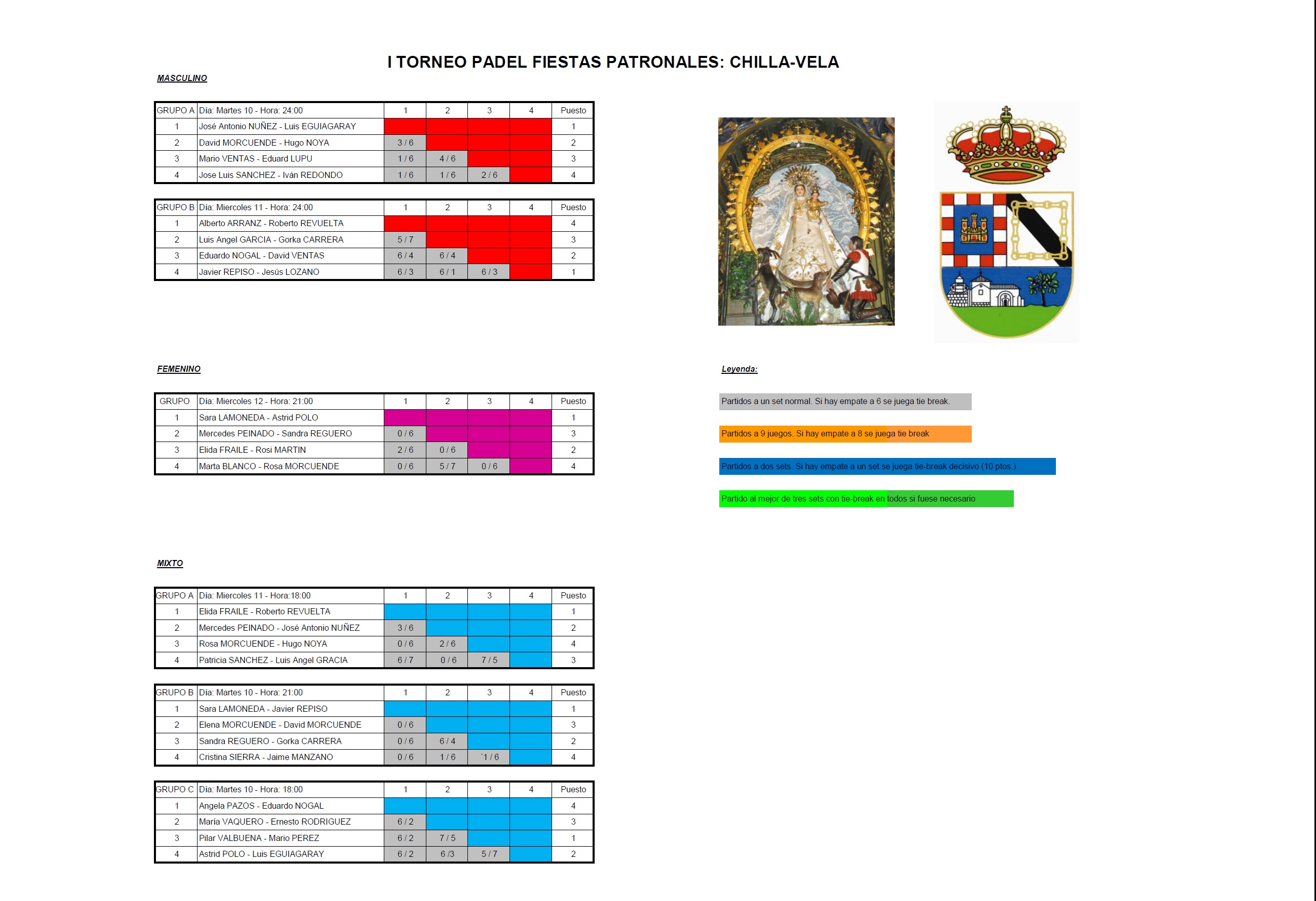 Entre los días 10 y 13 se celebró el I Torneo de Pádel de las Fiestas Patronales de Candeleda: La Romería de la Virgen de Chilla y La Vela. Las expectativas con respecto a las inscripciones se cumplieron, pues si bien en categoría femenina no se apuntaron muchas parejas si lo hicieron en categoría mixta. La mayoría de las jugadoras de la zona no tiene experiencia en torneos y, en esta ocasión, decidieron jugar acompañadas por quienes si la tenían. Al celebrarse en fechas laborables, los partidos se tenían que jugar entre las 18:00 horas y las 02:30, salvo el viernes en el que únicamente se disputarían las finales de las tres categorías. No se podía tener un número muy elevado de participantes ni disputar muchos partidos. Por ello después de la fase de grupos ya habría participantes eliminados. Pese a todo se apuntaron 8 parejas masculinas, 4 femeninas y 12 mixtas.