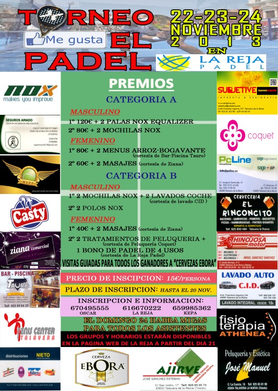 Os recordamos que este miércoles 20 de noviembre es el último día para apuntarse al torneo Me Gusta el Pádel que se celebrará en las instalaciones de La Reja, en la localidad de Pepino a 5 km de Talavera de la Reina. Hay que darse prisa porque las plazas están casi cubiertas. Os dejamos el cartel con todos los detalles