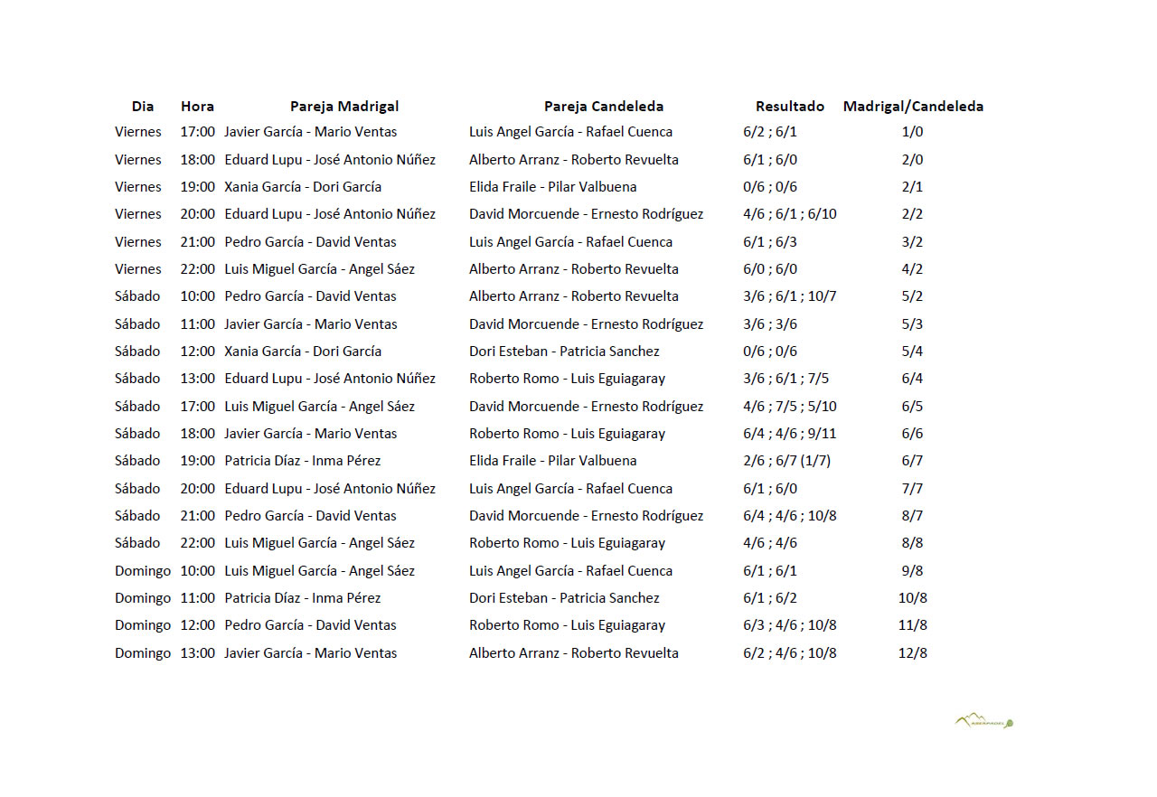 El pasado fin de semana se jugó un torneo de pádel entre los jugadores de los municipios de Madrigal de La Vera (Cáceres) y Candeleda (Avila). El torneo consiste en presentar por cada municipio 4 parejas masculinas y 2 femeninas (de momento) y que jueguen un todos contra todos en cada categoría. Se estableció que los partidos se jugaran a dos sets y que caso de empate se disputara un tie-break decisivo. El ganador tendrá en custodia el trofeo y se ocupará de grabarlo con el nombre de su municipio y la fecha. La idea es jugar esta Copa un par de veces al año para fomentar, aún más, el pádel en los dos municipios.