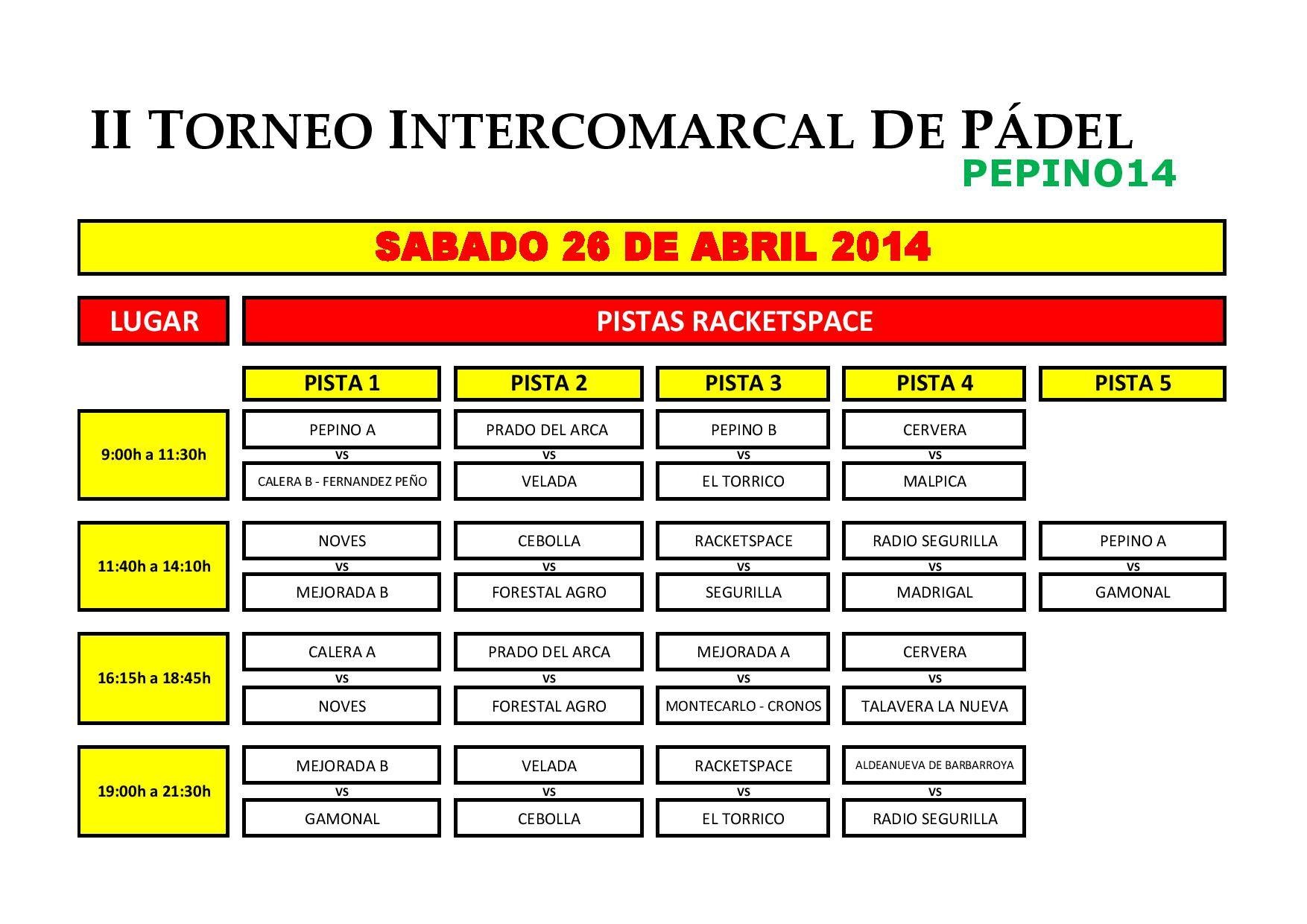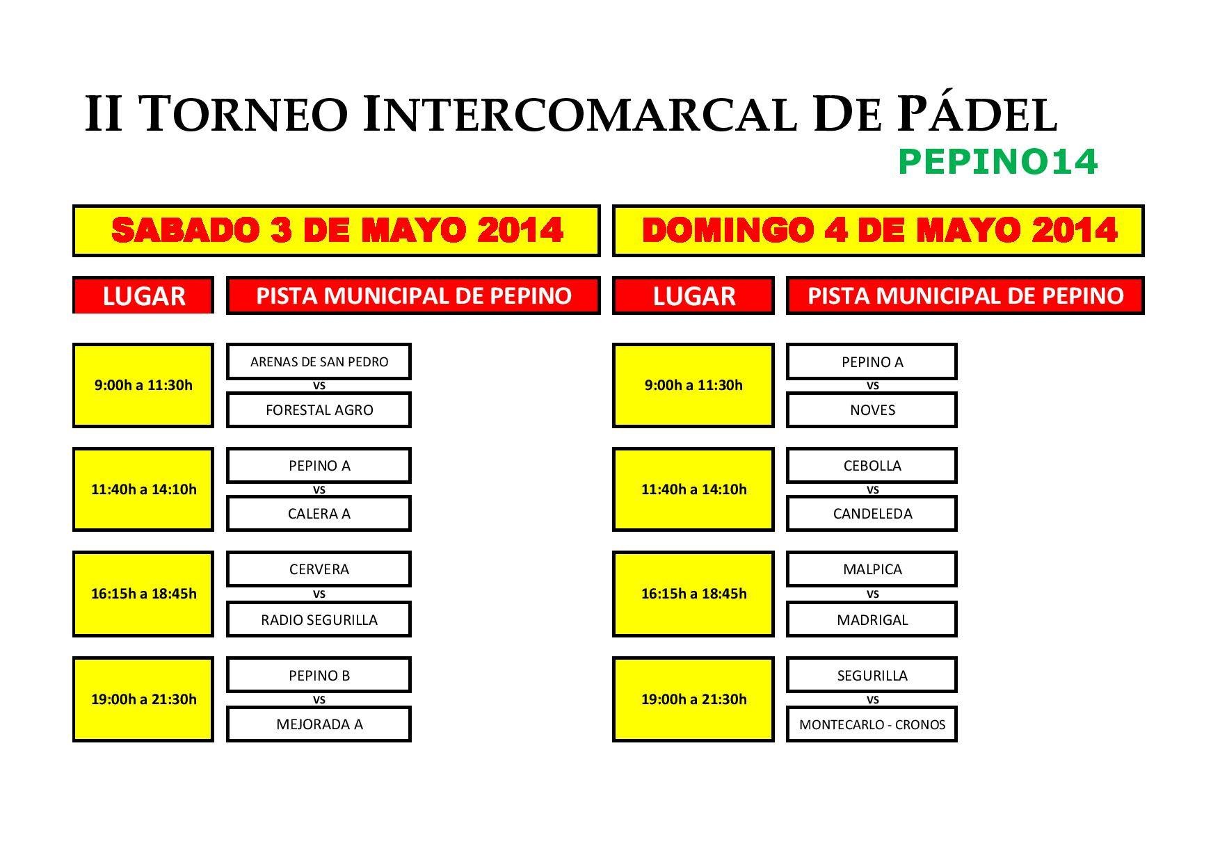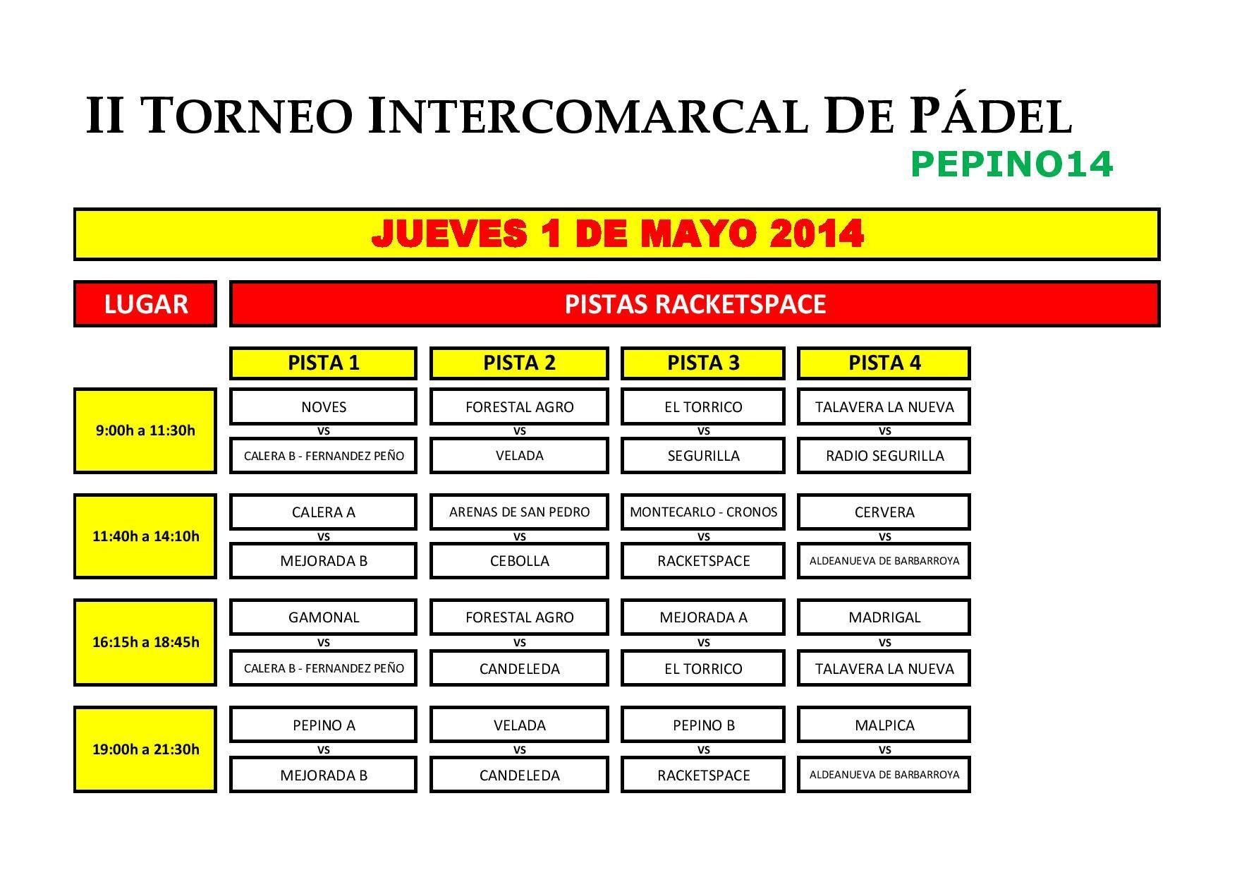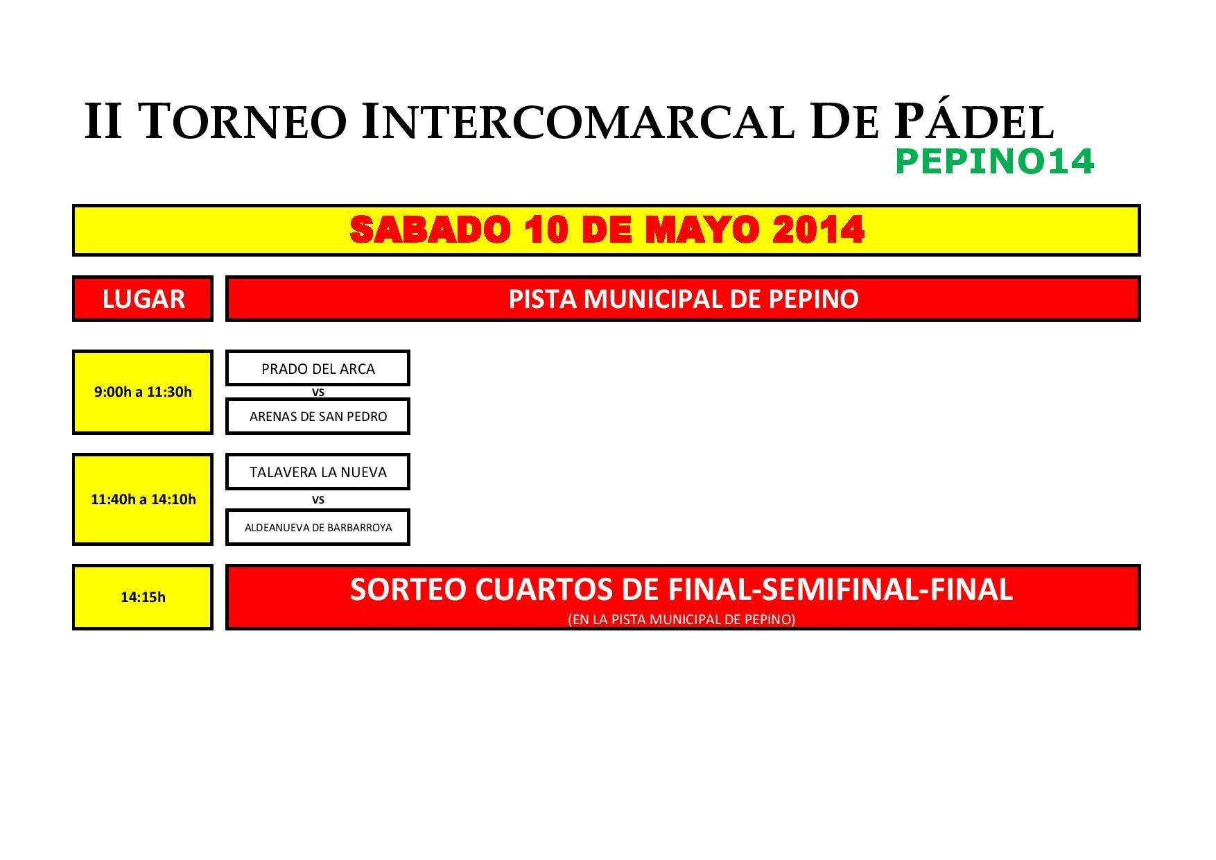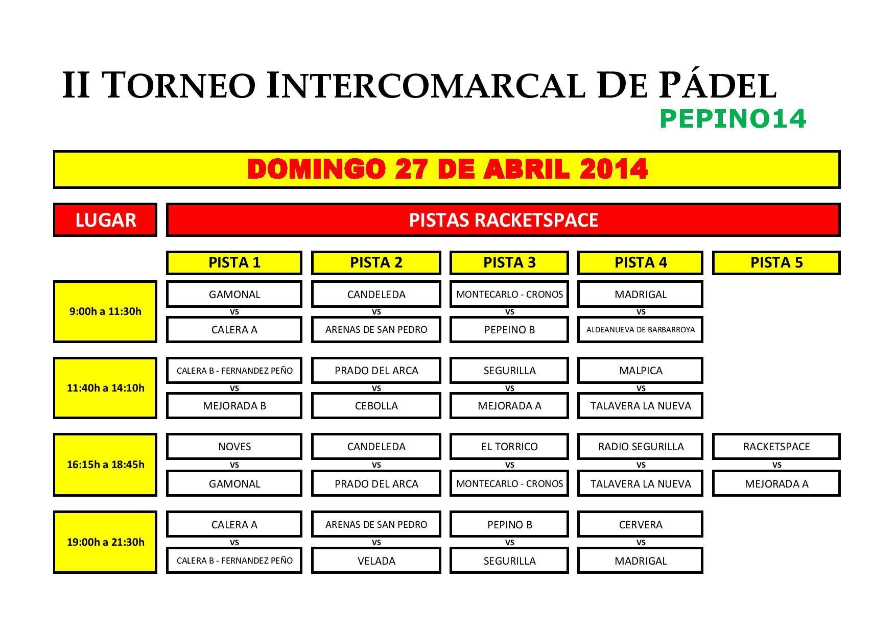 Arenas de San PedroCandeledaGeneralMadrigal de La VeraTalavera de la ReinaTorneos Cuadros de la primera fase del II Intercomarcal de Pádel de Pepino 15 abril 2014 LE Aquí os dejamos los cuadros de la primera fase del II Torneo Intercomarcal de Pádel de Pepino (cortesía de Megafactory). ¡Mucha suerte y diversión a todos! Compartir en redes: