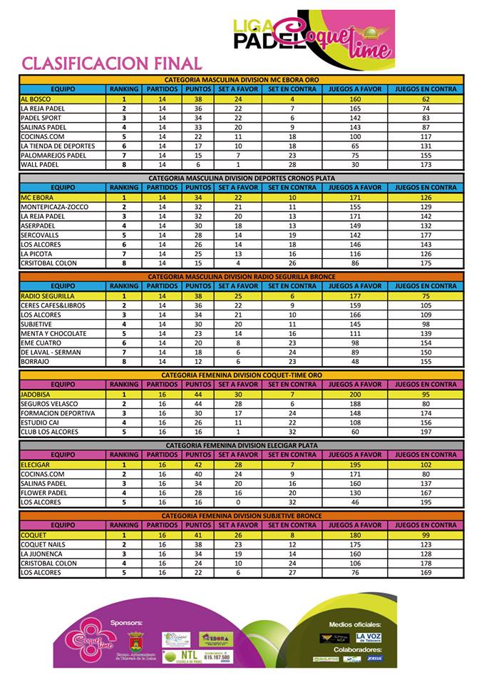 Aquí dejamos los resultados de la temporada regular de la liga y el cartel del Master Final que tendrá lugar el próximo fin de semana en las instalaciones de La Reja Pádel. ¡Mirad que cracks vienen! ¡¿Os lo váis a perder?!