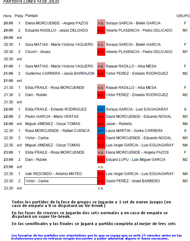 Este lunes, 14/07/2014, empezará la disputa de este torneo. Es uno de los más esperados por todas las palas de la zona y que más expectación viene suscitando. El año pasado se disputó en fin de semana, pero éste se le ha querido dar un formato semanal que permitirá más horas de disfrute a los participantes. Aquí dejamos los grupos de las distintas categorías y los partidos de la primera jornada.
