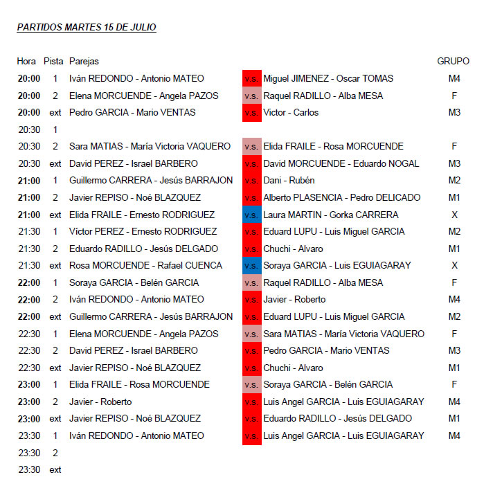 CandeledaGeneralTorneos Segunda jornada del Torneo Semana de Pádel Candeleda 15 julio 2014 LE Aquí dejamos los partidos que se van a disputar en esta segunda jornada del Torneo Semana de Pádel Candeleda. Recordamos a todos los participantes y visitantes que se pueden adquirir bebidas dentro de las instalaciones. Compartir en redes: