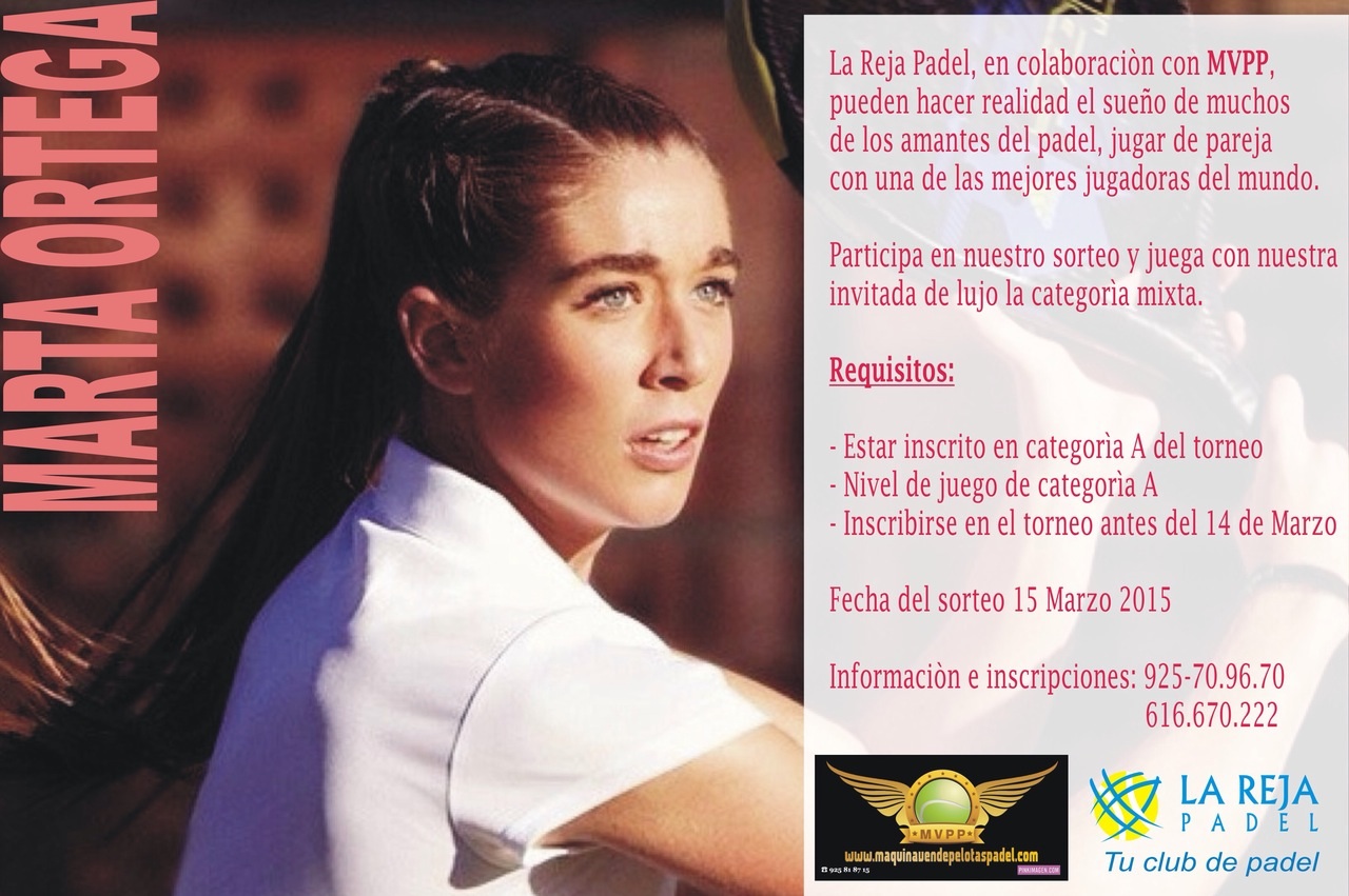 Como aperitivo del inicio de temporada del Word Pádel Tour, podremos ver, gracias a Máquina Vende Pelotas de Pádel, a Martita Ortega en acción. Además, entre los caballeros que se apunten en la categoría A, y que se tenga contrastado que juegan a ese nivel, se sorteará quién será su pareja en la categoría mixta. ¡Un auténtico lujazo!