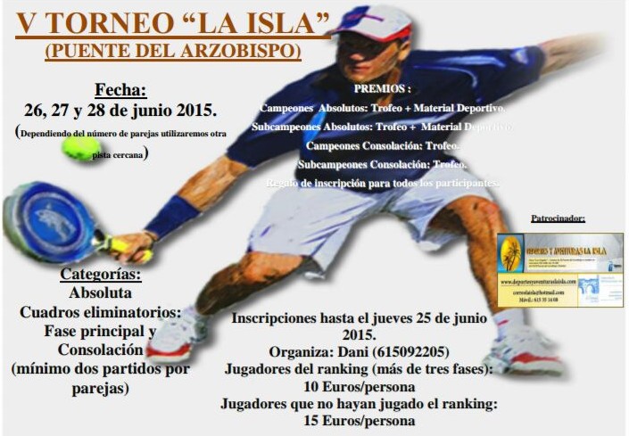 El otro, el V Torneo»La Isla» que se celebrará en Puente del Arzobispo los días 26, 27 y 28 y constará sólo de categoría absoluta, siendo el sistema de competición en cuadro, con fase principal y consolación.