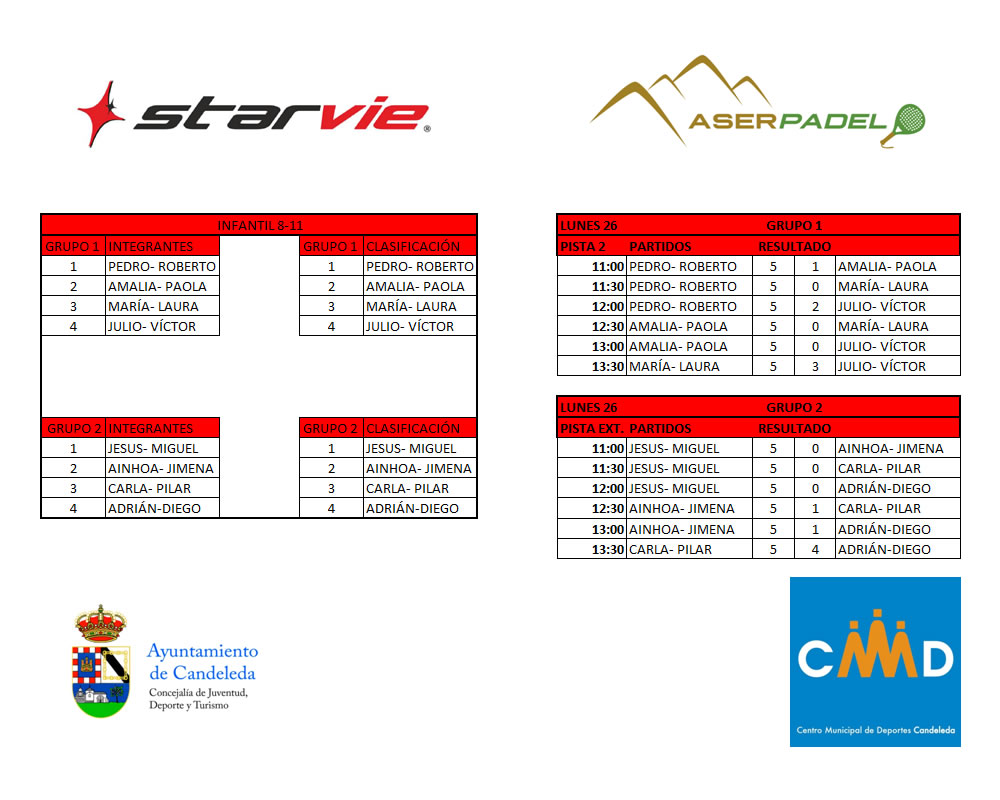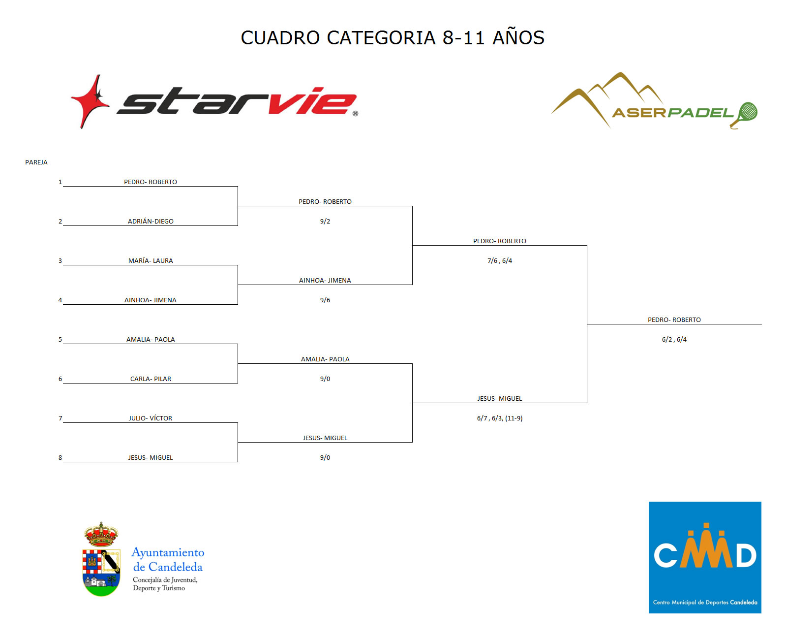 En la categoría de 8 a 11 años todos los participantes tienen el pádel como actividad extraescolar. Lo que nos demostraron todos ellos es que prevalecía el pasar un rato divertido sobre la propia competición. No obstante hubo momentos de «tensión competitiva» pues algunas de las parejas que se formaron se complementaban bastante bien y empezaban a dar sustos a las más experimentadas. Otras sorprendieron por su buen rendimiento competitivo cuando se pensaba que eran las fáciles de batir. En resumen un bonito torneo.