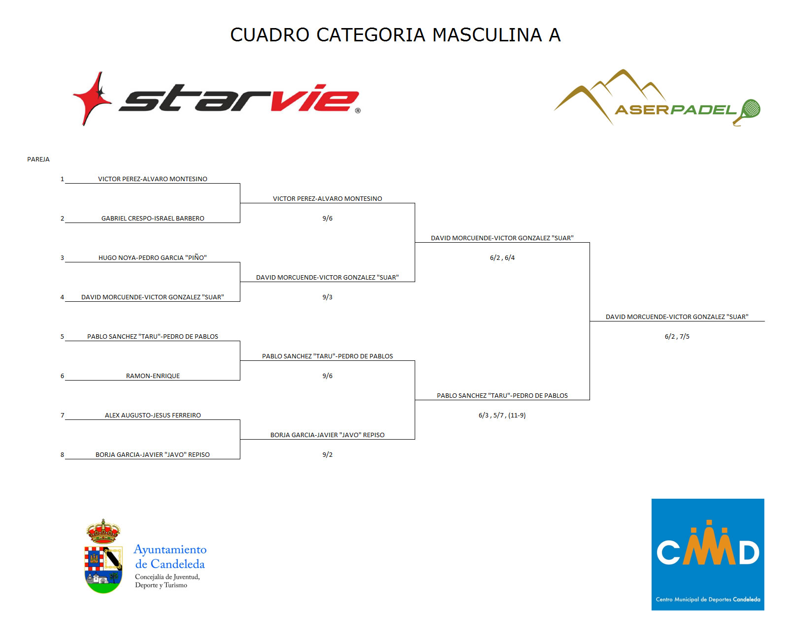 La categoría masculina muy animada y con sorpresas. La pareja considerada cabeza de serie número 1 caía en semifinales de la A en un vibrante partido que se resolvió en el tie-break decisivo. Sus verdugos no consiguieron hacerse con la victoria del torneo al disputar un discreto primer set en la final y a que sus rivales supieron aguantar, con oficio, el intento de arrebatarles el segundo set. En la categoría B los campeones de la infantil 12-15 se lo pusieron muy difícil a la pareja, a la postre, ganadora del torneo obligándoles a disputar un tie-break decisivo en semifinales.