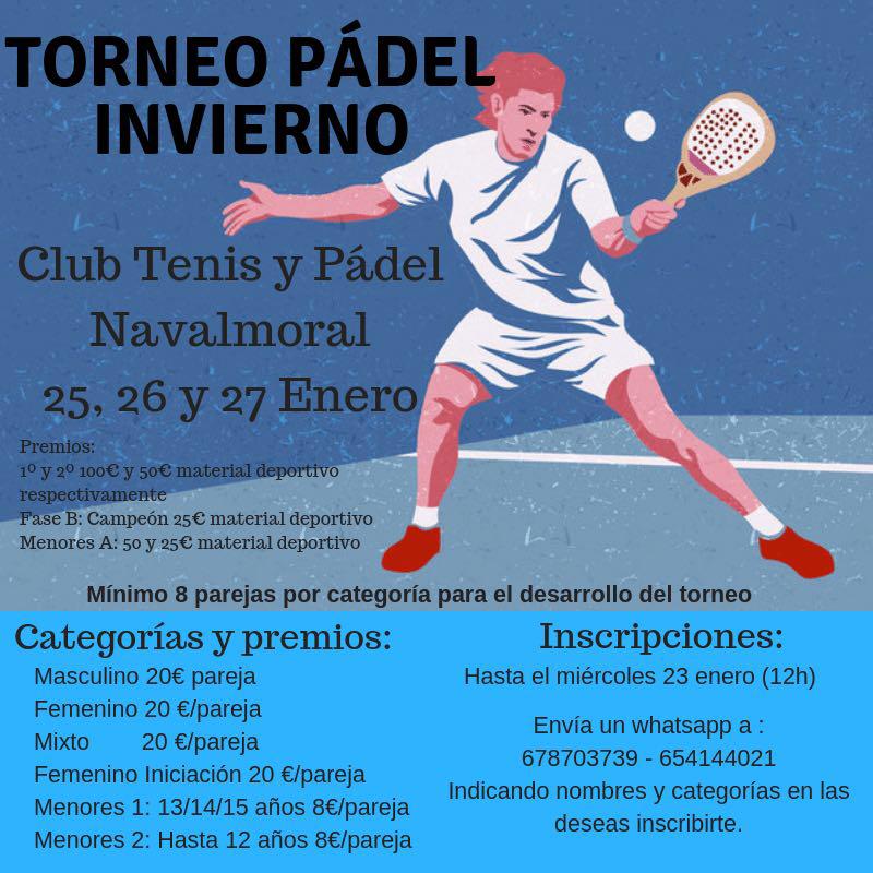 GeneralNavalmoral de la MataTorneos Torneo Pádel de Invierno Navalmoral 18 enero 2019 LE Del 25 al 27 de enero se celebrará en las instalaciones del Club de Tenis y Pádel de Navalmral de la Mata el Torneo de Pádel de Invierno. Se incluyen categorías absolutas y de menores Aquí os dejamos el cartel: Compartir en redes: