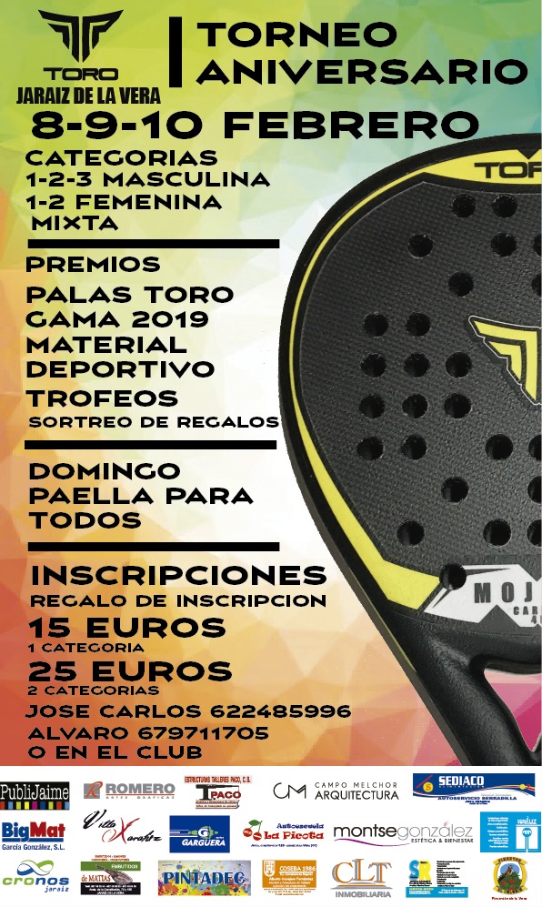 GeneralLa VeraTorneos Torneo I Aniversario Toro 4 febrero 2019 LE Hace un año que la marca Toro trasladó su fábrica, dentro de la misma localidad (Jaraíz de La Vera), a un club de pádel que lleva su nombre. Este fin de semana celebran su aniversario con un torneo plagado de premios. ¡¿Te lo vas a perder?! Compartir en redes: