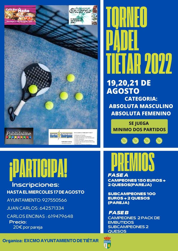TiétarTorneos Torneo Pádel Tiétar 2022 12 agosto 2022 LE En la cacereña localidad de Tiétar se celebrará durante los días 19, 20 y 21 el Torneo de Pádel Tiétar 2022. Los detalles los tienes en el cartel Compartir en redes: