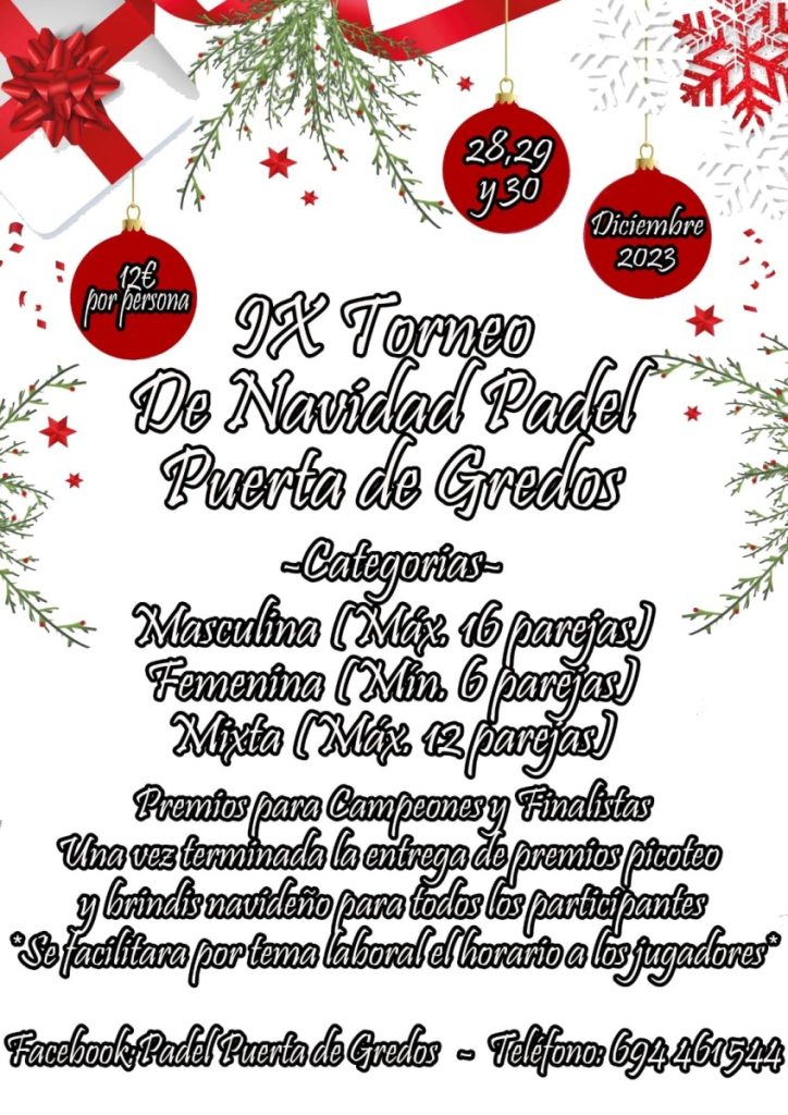CartelRamacastañasTorneos IX Torneo de Navidad Pádel Puerta de Gredos 15 diciembre 2023 LE Todos los que os apuntéis al torneo tendréis la oportunidad de estrenar el nuevo césped (azul y rizado) que tienen previsto instalar justo antes de la celebración de este IX Torneo de Navidad Puerta de Gredos Compartir en redes: