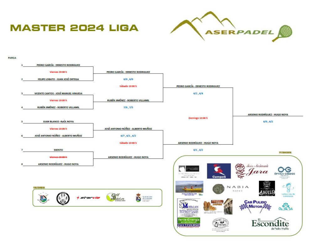 Durante este fin de semana se ha disputado el Máster de la Liga Aserpádel 2023-2024. En un principio eran ocho parejas, pero al fallar dos integrantes de sendas parejas se optó por unir a sus compañeros; por lo que el Máster Aserpádel fue disputado por siete.