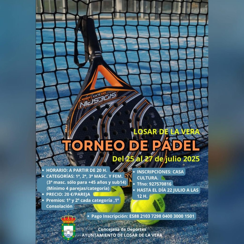 CartelLa VeraTorneos Torneo de Pádel en Losar de La Vera 8 julio 2025 LE Otro torneo de pádel para el mes de julio. En este caso en Losar de La Vera. Todos los datos en el cartel Compartir en redes: