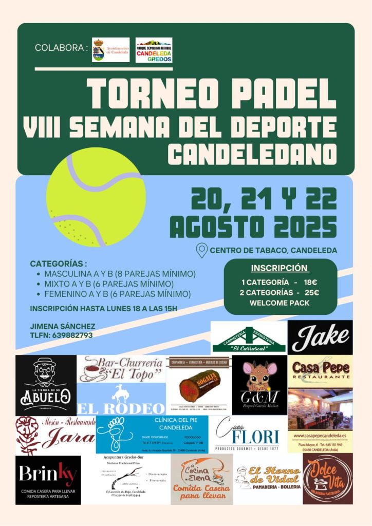 Serán los días 20, 21 y 22 de agosto cuando se celebrará finalmente el Torneo de Pádel VIII Semana del Deporte Candeledano.
